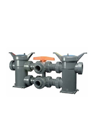 Unwanted particles are removed as the process media passes through a perforated or meshlined filter basket. The filter basket traps the unwanted particles while the process media flows freely. If uninterrupted flow is required during cleaning or changing the filter basket, nothing beats the amafiltergroup plastic duplex strainer. The line never has to be shut down for cleaning or servicing the baskets. When one filter basket is full, the flow is diverted to the other filter basket by a simple movement of a single lever. Plastic three-way valves, an integral part of the unit, provide tight shut off.